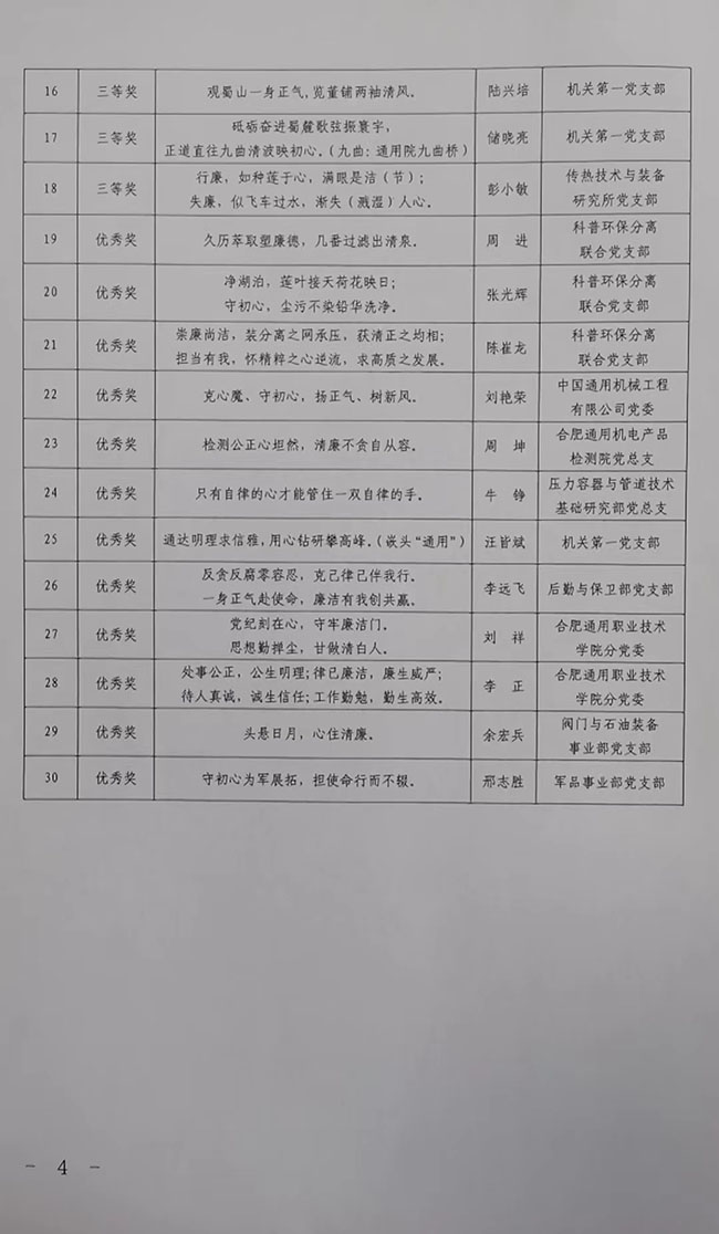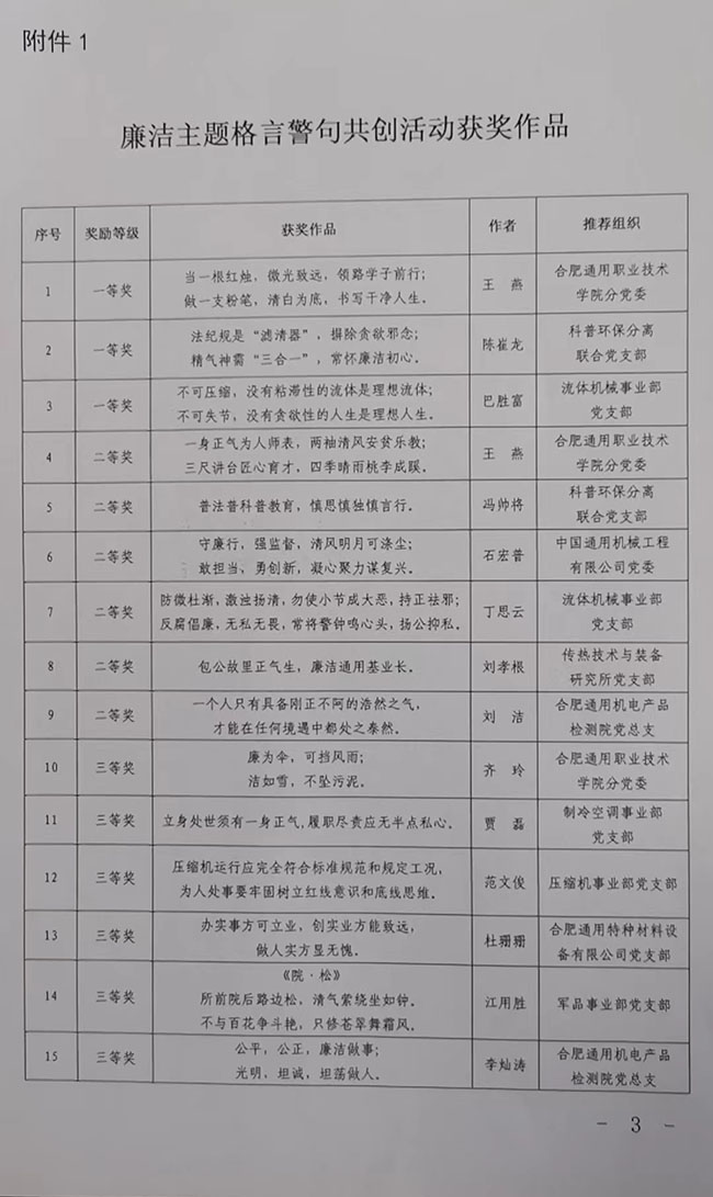 為深入貫徹落實黨的二十大和二十屆中央紀委二次全會精神,落實中共中央辦公廳《關于加強新時代廉潔文化建設的意見》,引導全院干部職工進一步增強廉潔自律意識,營造干事創業的良好氛圍,2023年5月院紀委組織開展了以“崇廉尚潔·擔當有我”為主題的廉潔格言警句共創活動。活動開展以來,各基層黨組織動員廣大干部職工積極創作投稿,共報送了99篇意蘊深刻、特色鮮明的作品。經過多輪評選,共評出一等獎作品3篇,二等獎作品6篇,三等獎作品9篇,優秀獎作品12篇,優秀組織獎1名。